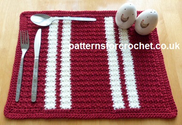 Edging - ch1, 1sc in base of ch1, 1sc in each sc to last sc, 3sc in last sc, working down first side of placemat, work 1sc in each row end to corner, 3sc in corner, 1sc in each ch along cast on edge, 3sc in corner, 1sc in each row end up second side of place mat, 1sc in corner, sl st to first sc. Turn.