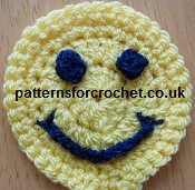 Finishing - Attach eye's to top of first dc row with a space between them, attach mouth around top of second dc row in a half moon shape, tack to the head each end of ch