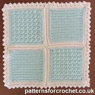 Once you have made and ss together as many squares as you need for your project, join yarn to a corner and with 4.00mm hook work 1ch, 2dc into base of 1ch, 1dc into each dc around all four sides, working 3dc into corners, 1dc into base of 1ch, ss to first dc on beginning of row. Turn.