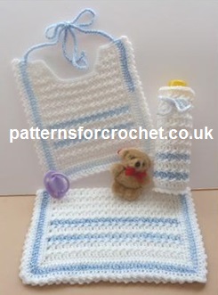 1dc into base of ch, 1dc into each tr around 3 sides of bib (work 3dc into corners)